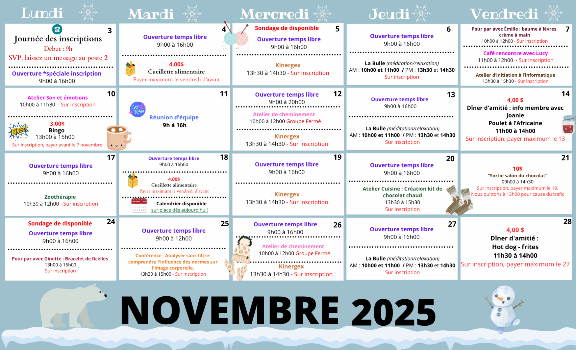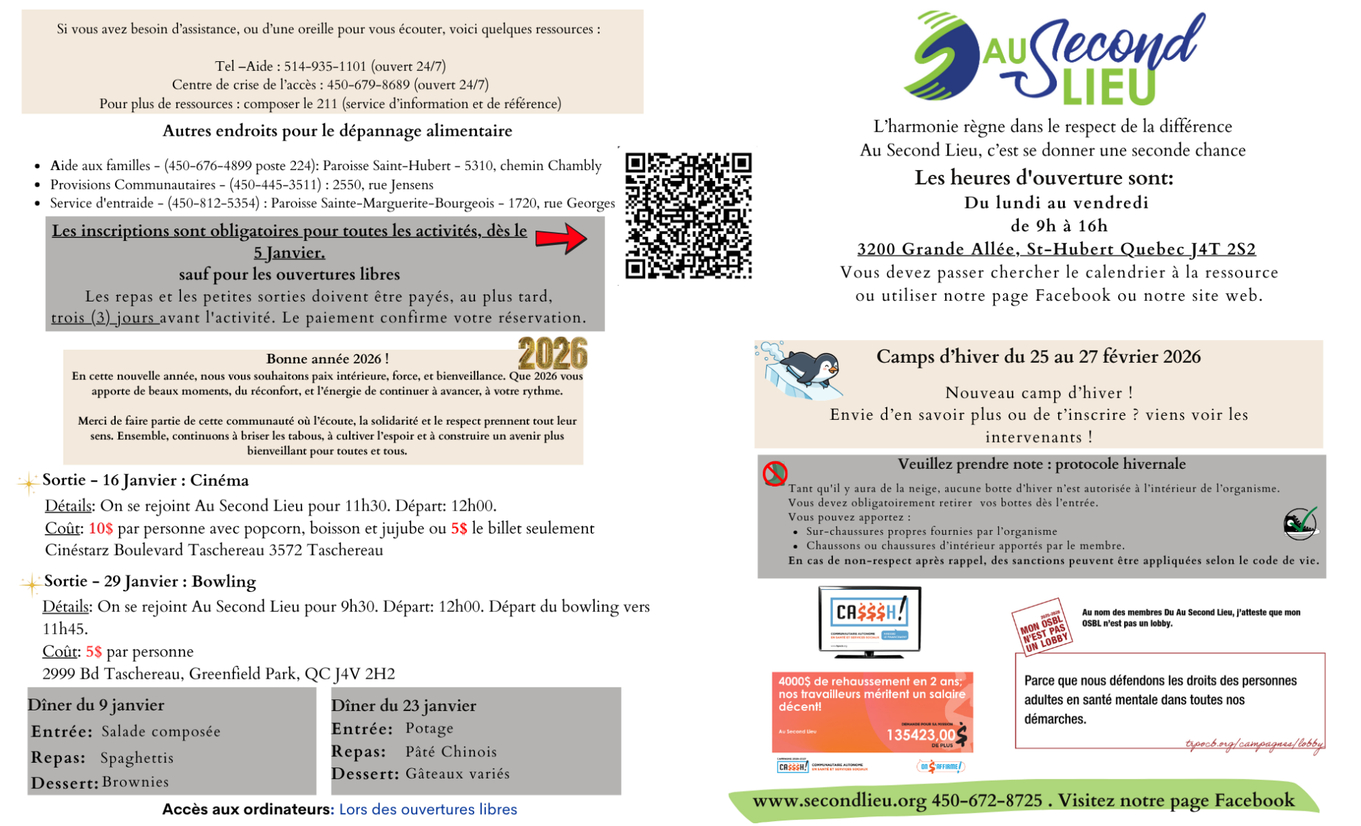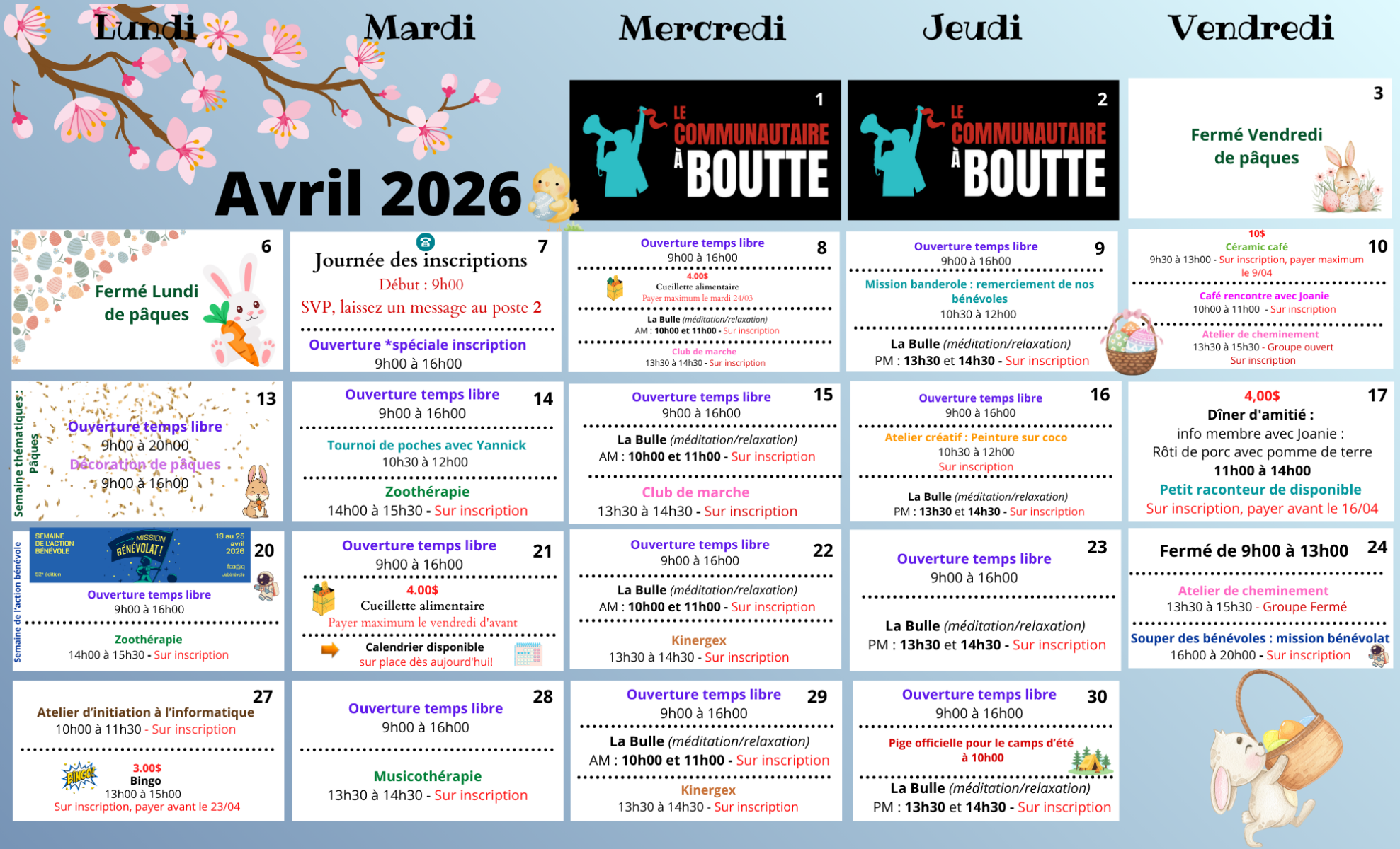 Étant donné les consignes actuelles émises par la santé publique, vous devez obligatoirement vous inscrire aux activités et sorties.