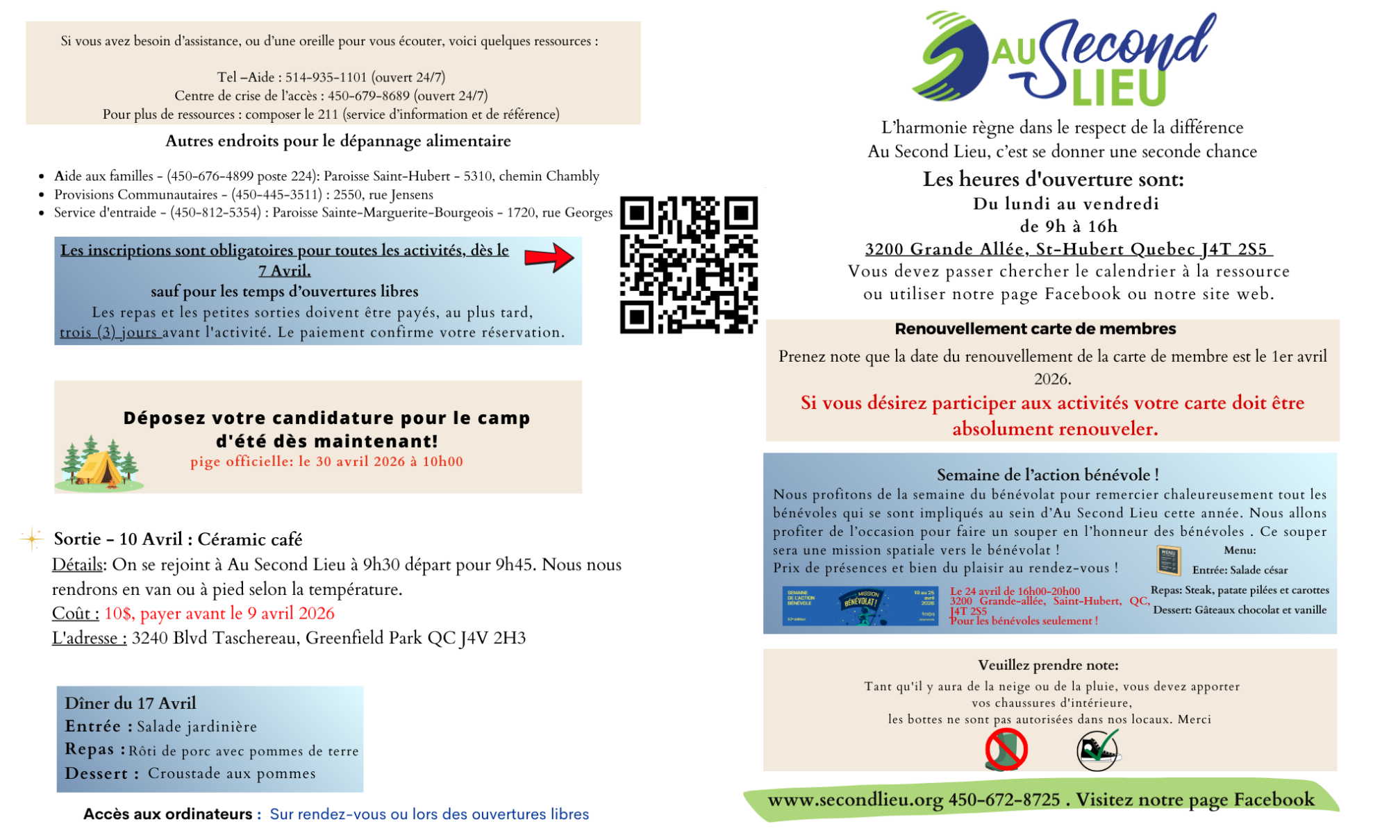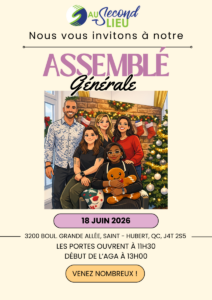 Au Second Lieu est une ressource alternative située à Saint-Hubert qui offre des activités aux adultes vivant ou ayant vécu une problématique en santé mentale, afin de se réapproprier de leur pouvoir en tant qu’individu, qu’elles soient plus autonomes et qu’elles s’intègrent plus facilement dans leur communauté.